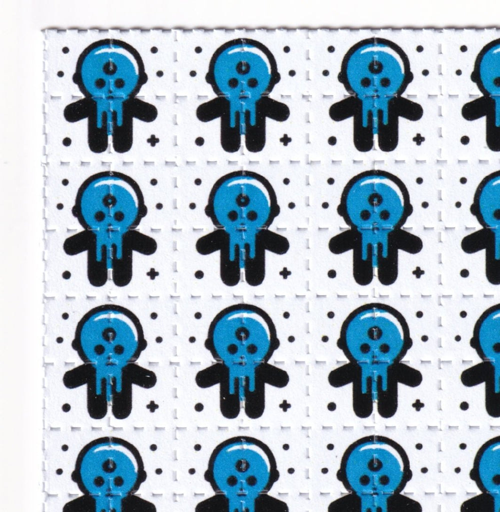 Our designs are printed with a plant based food grade ink, printed on absorbent blotting paper with brightly colored perforated psychedelic artwork.