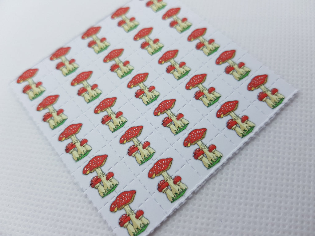 Bright red magic mushroom design with each 4 tab split sharing each mushroom.