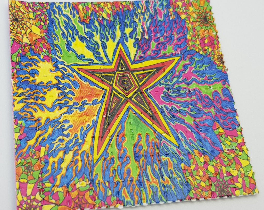 Our designs are printed with a plant based food grade ink, printed on absorbent blotting paper with brightly colored perforated psychedelic themed artwork.