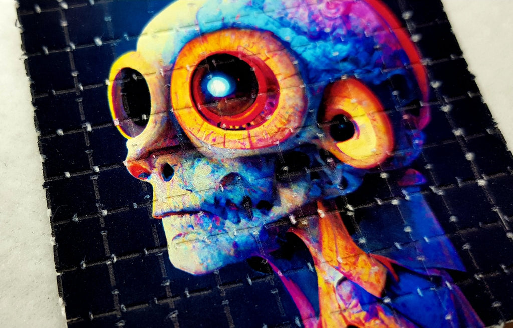 Our designs are printed with a plant based food grade ink, printed on absorbent blotting paper with brightly colored perforated psychedelic artwork.