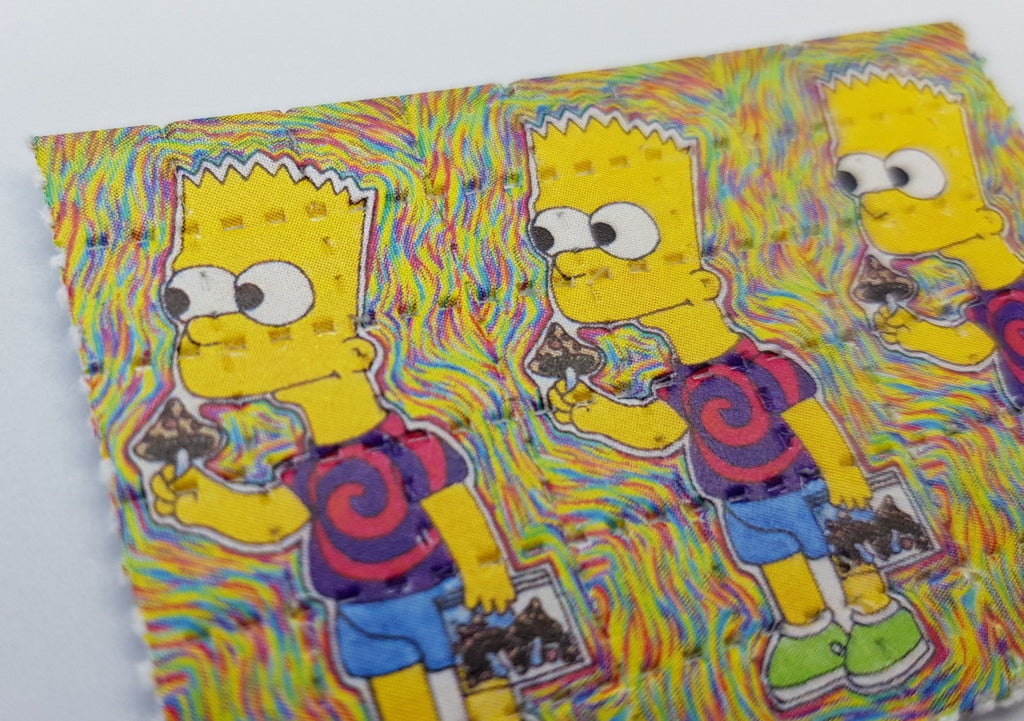 Simpsons character Bart on a trippy background enjoying a bag of magic mushrooms.