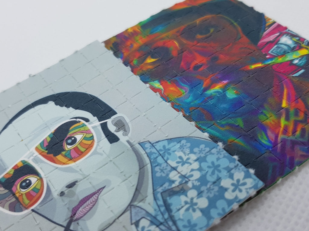Our designs are printed with a plant based food grade ink, printed on absorbent blotting paper with brightly colored perforated psychedelic artwork.