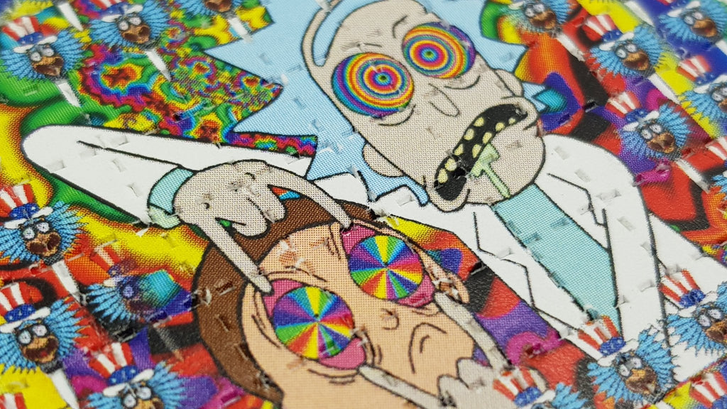 Rick and Morty psychedelic blotter art with mixed colored spiral background.