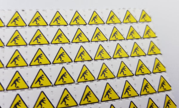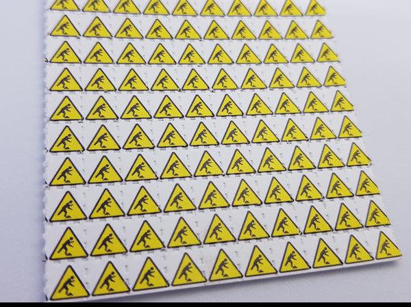 A yellow and black tripping hazard sign on a white background on each tab of this 100 tab sheet