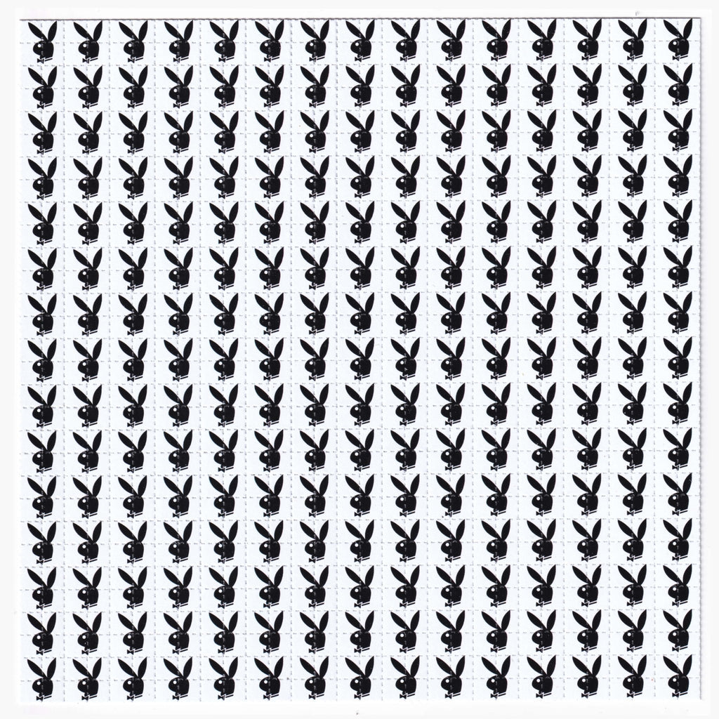 The iconic Playboy Bunny logo covers this black and white sheet.
