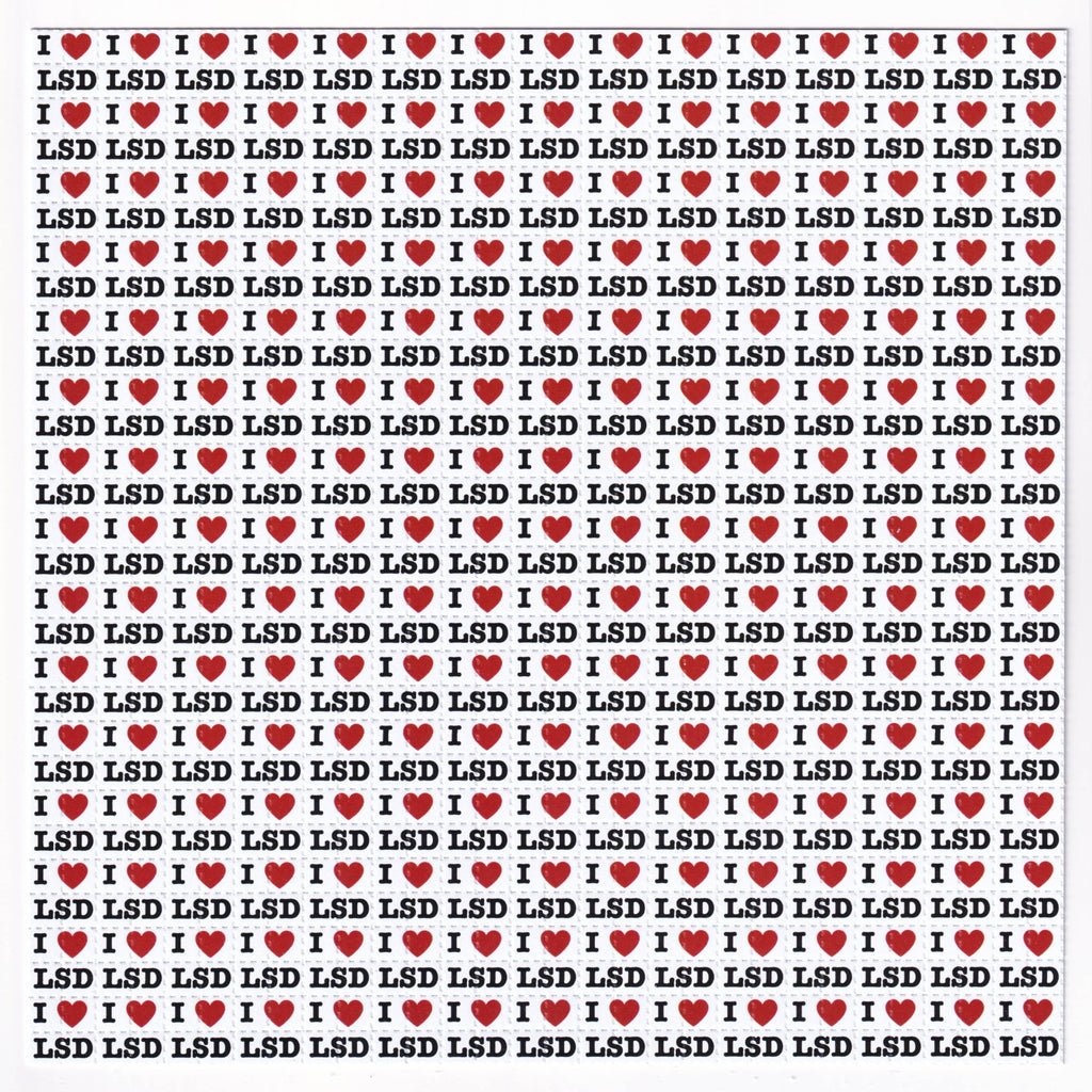 With bold black lettering and a bright red heart symbol "I ❤️ LSD" printed over every 4 tab split on this 900 tab perforated blotter art print.
